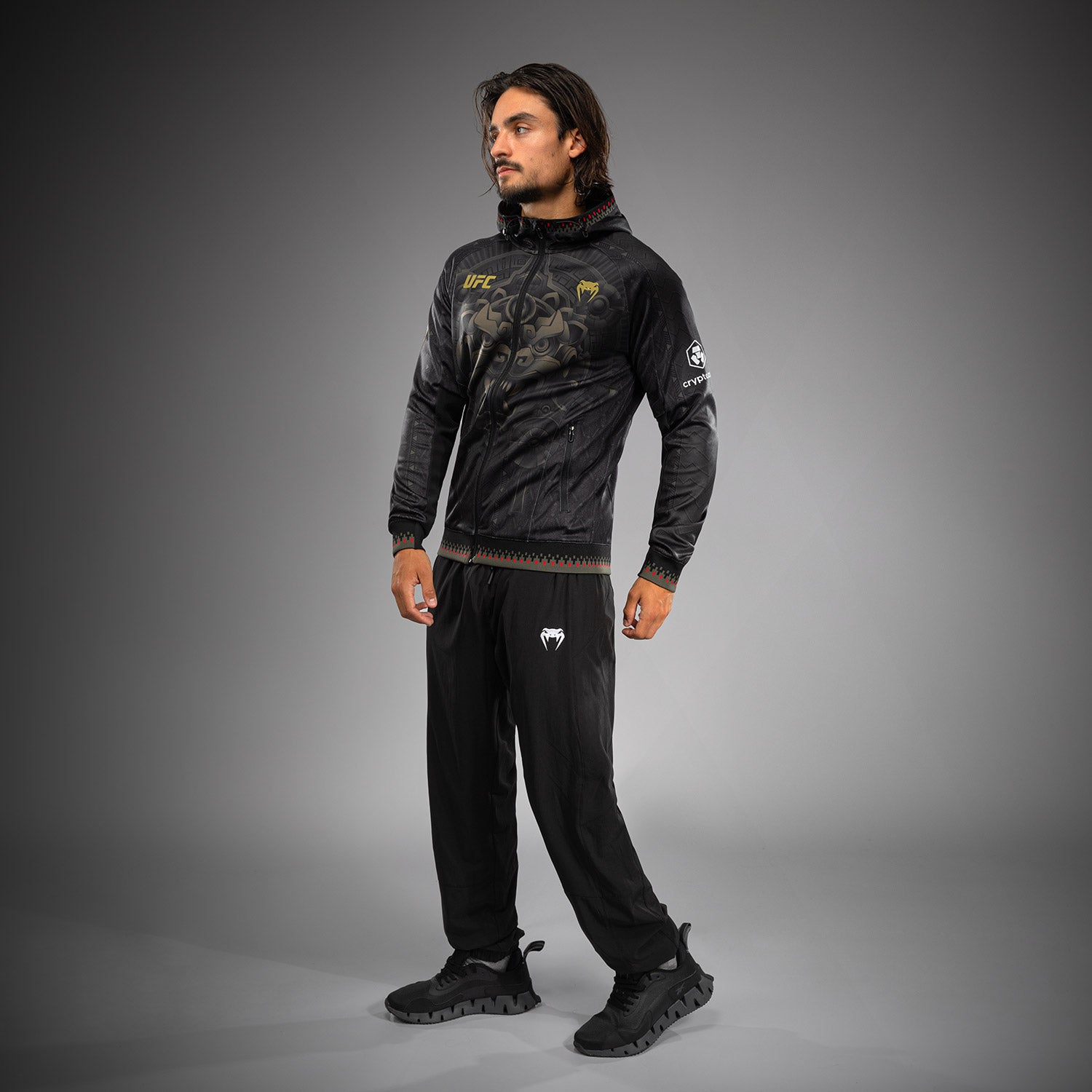Der Men’s Noche UFC 2.0 By Venum Authentic Fight Night Walkout Hoodie zeigt den aztekischen Gott Tezcatlipoca in Jaguarform. Er gilt als Beschützer der Krieger und steht für Stärke und Transformation – Sinnbild für Widerstandskraft und den Weg zur Unabhängigkeit Mexikos.
