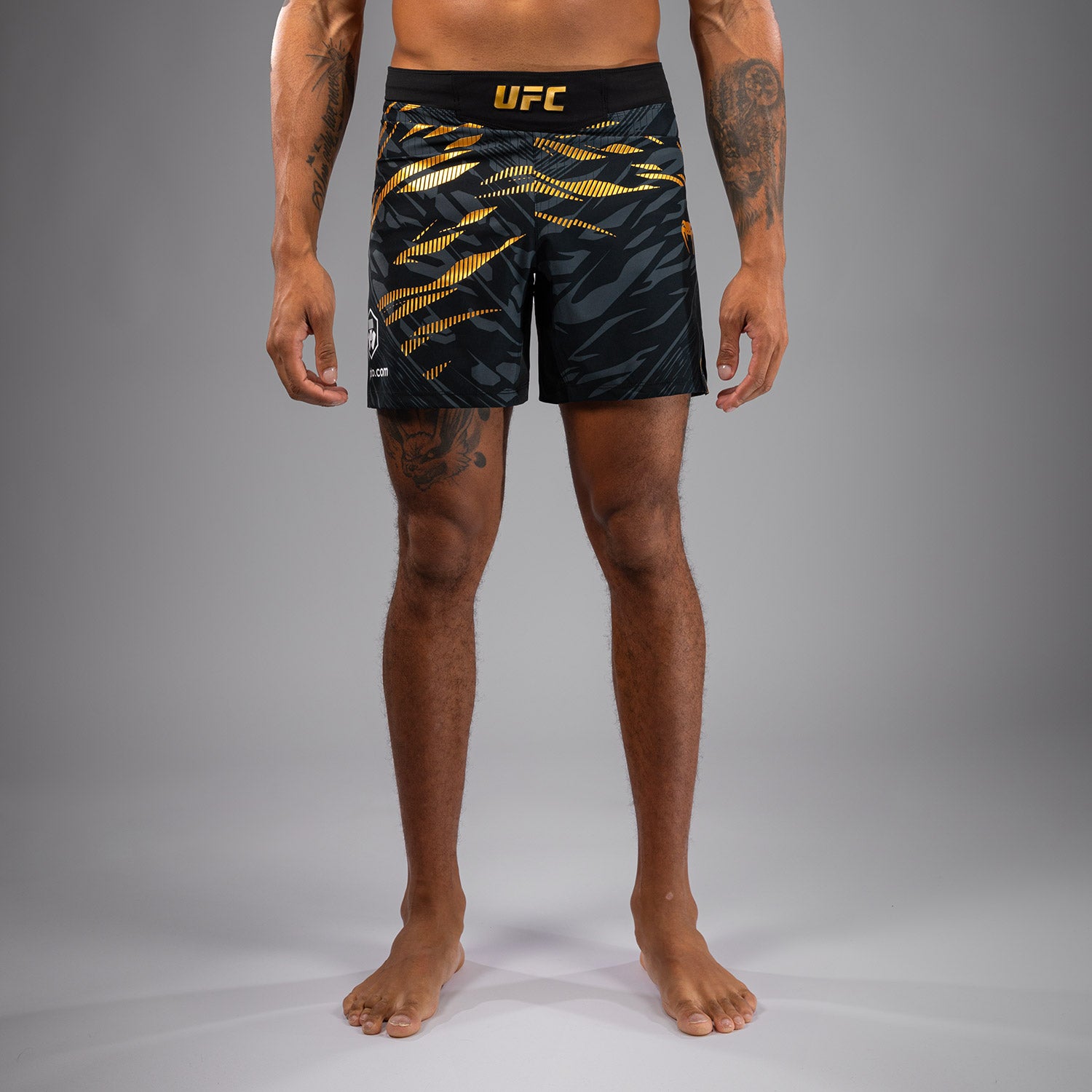 Entwickelt für Beweglichkeit und Komfort, verfügen diese Shorts in Schwarz/Gold in Oberschenkel-Länge über thermo-geklebt Seiten-Schlitze für größere Bewegungsfreiheit während des Stand- und Bodentrainings. Der Stoff ist leicht, strapazierfähig und flexibel, während der elastische Bund einen sicheren Halt bietet - die ideale Shorts für Kampfsportarten. Diese Schwarz/Gold-Farbgebung ist UFC-Meistern vorbehalten.