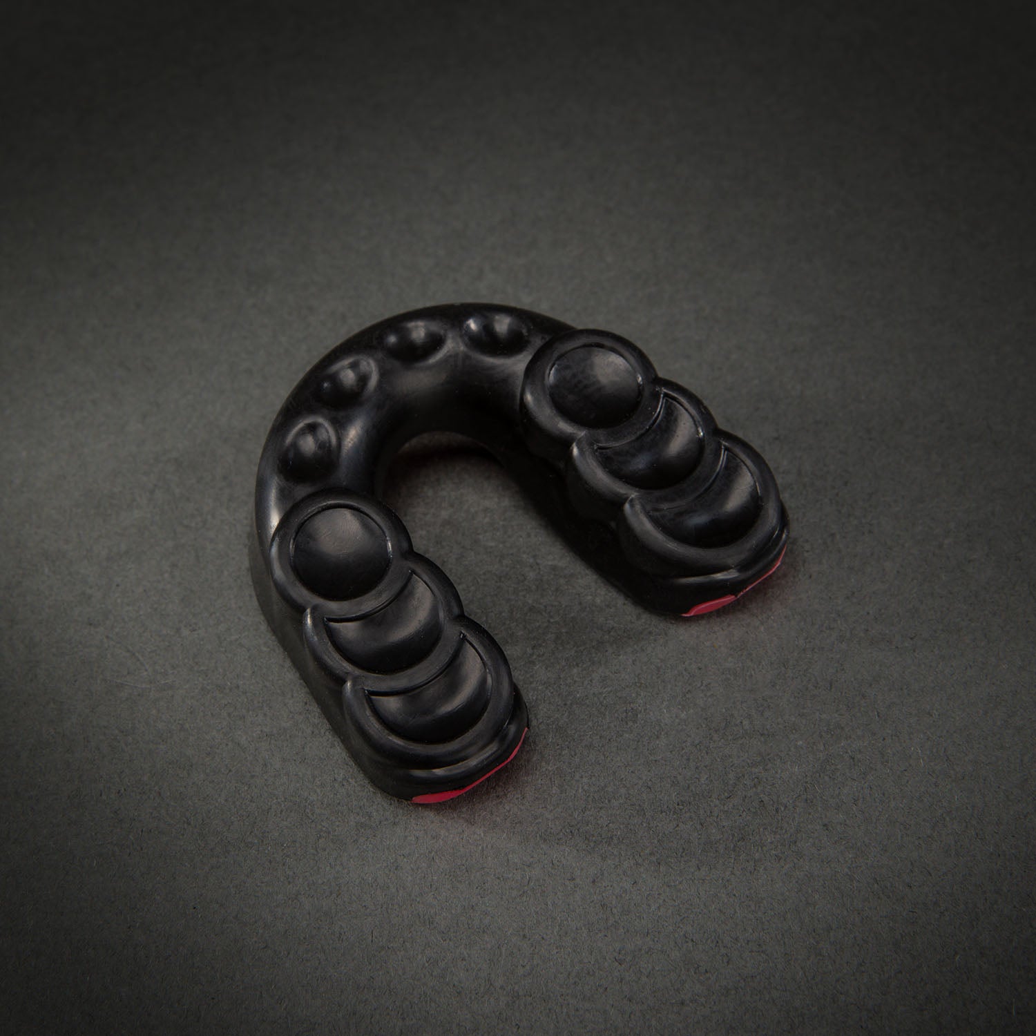Der untere Gummi-Rahmen, absorbiert den Schock, wenn du beißt und diffundiert die Kraft in Richtung deiner stärksten Zähne.