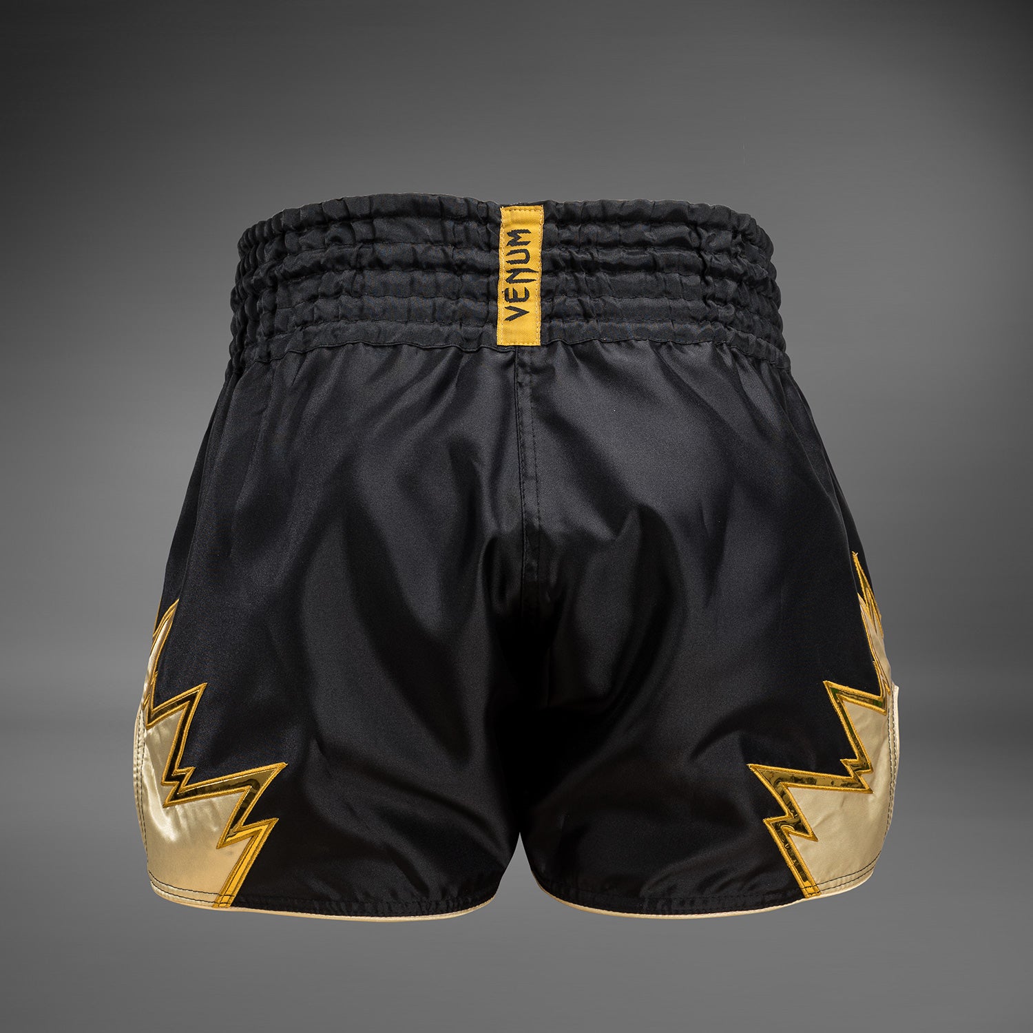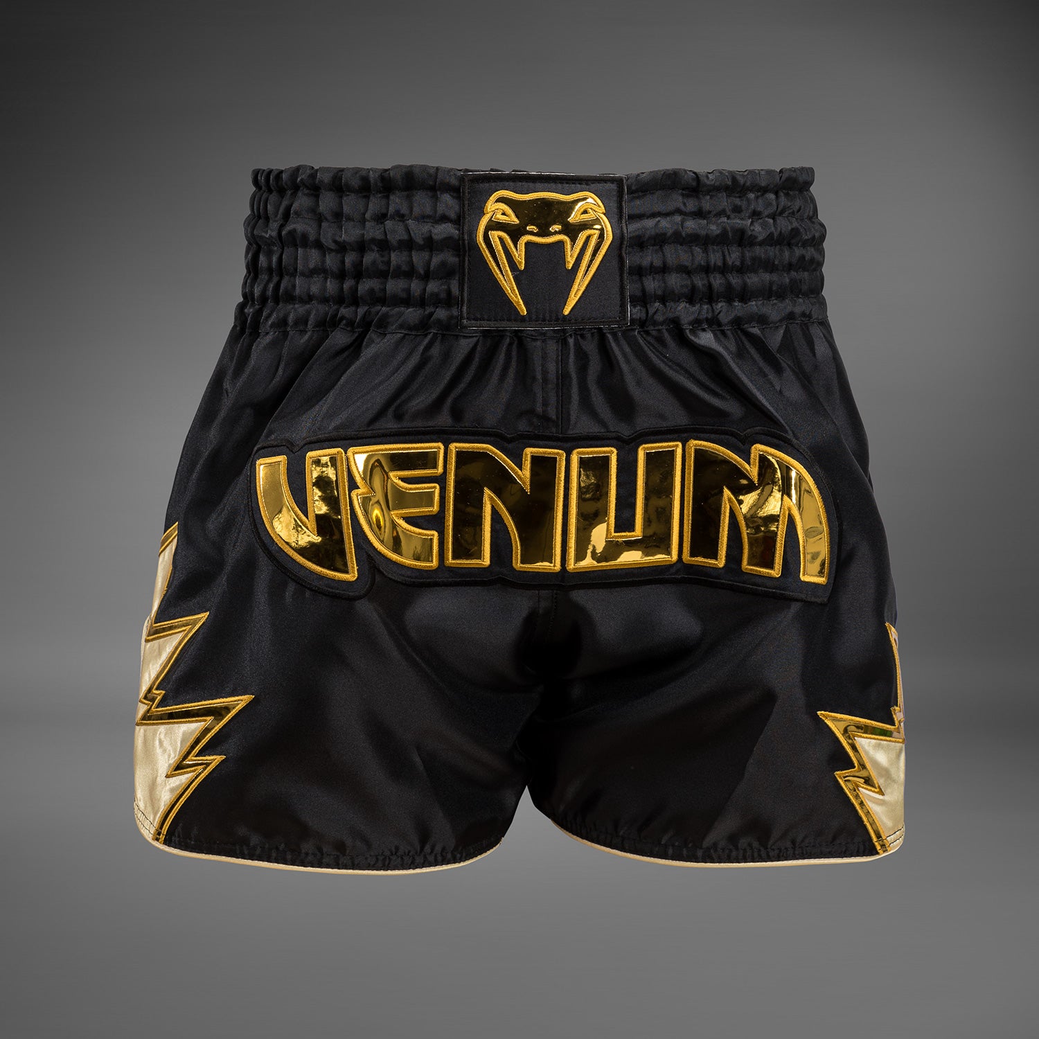 Ein goldener reflektierender Patch mit dem Aufdruck "Venum" befindet sich auf der Vorderseite der Shorts und am vorderen Gürtel. In der Zwischenzeit erstrecken sich Flammen, ebenfalls in Gold, an den Seiten der Shorts.